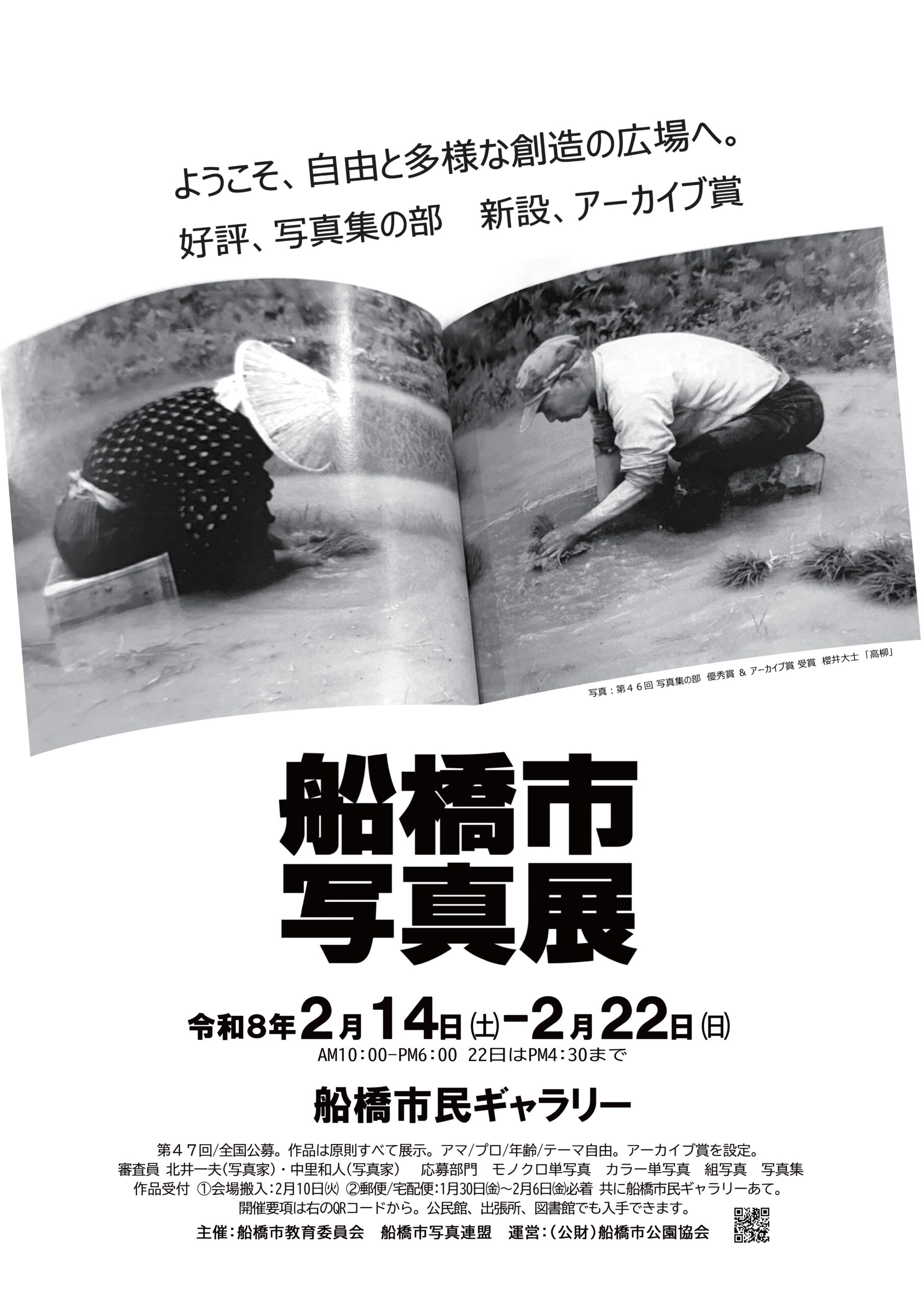 | 第47回船橋市写真展 ~ようこそ、自由と多様な創造の広場へ~ ・応募作品はすべて展示します。 ・全国公募、アマ、プロ、年齢自由です。 ・写真集を歓迎します。 ・時代/記録性を評価します。 写真展の詳細はこちらをクリックしてください。 |