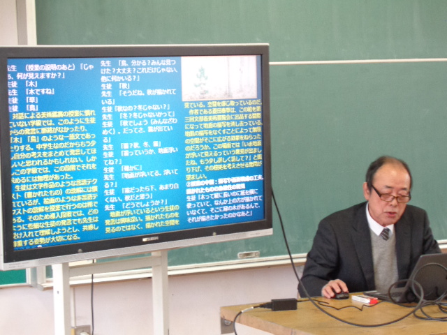 (モニター画面の「はじめ・なか・おわり」は「つながる物語」の例題)