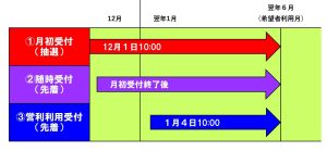 利用者登録がお済みの方は、上記(1)の月初受付抽選会終了後の空き室を、毎月6日からネットや利用者端末で随時仮予約ができます。(事務室窓口での受付時間:午前9時から午後5時まで)